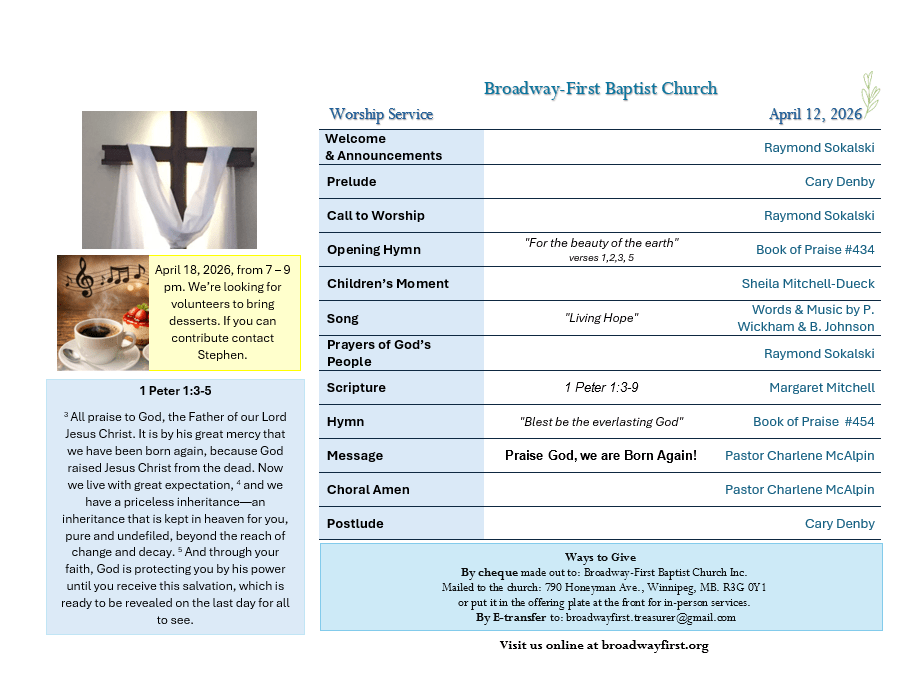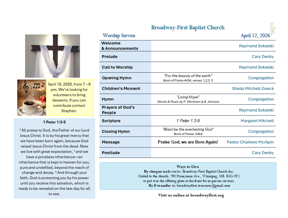 Date, Time, Place: April 12, 2026, 10:30 a.m. in the Sanctuary