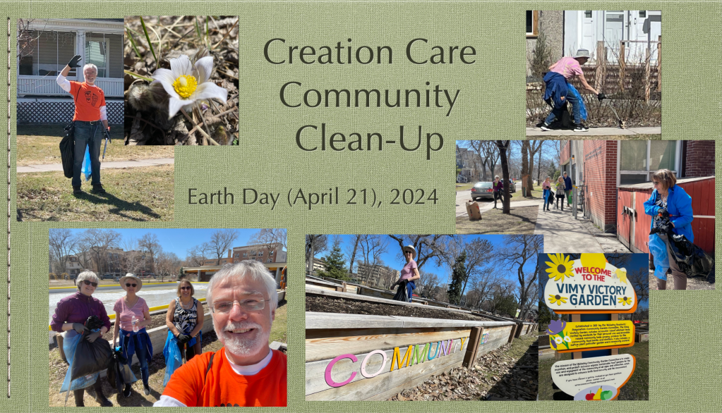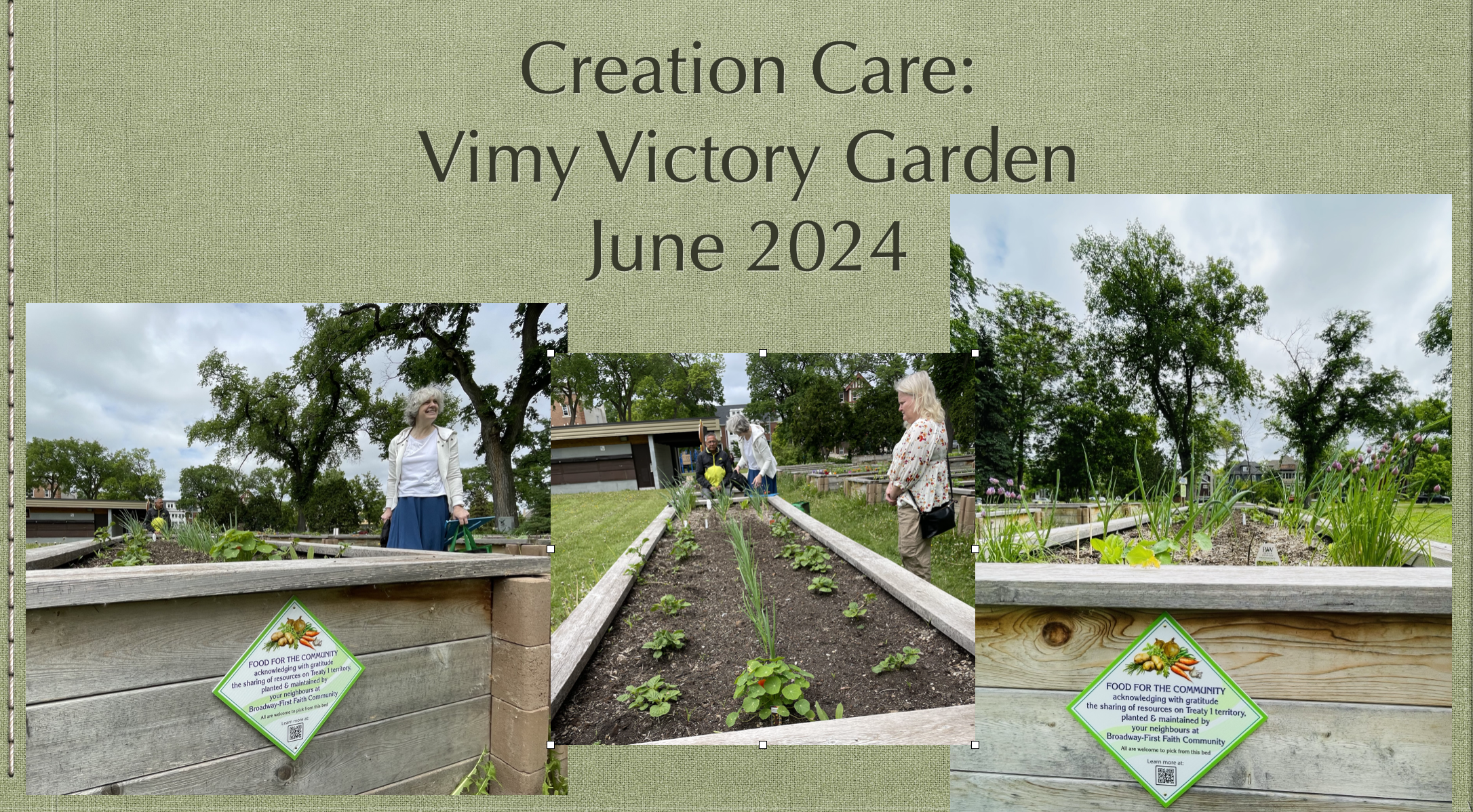 Seeds planted in Mays have sprouted this rainy month of June! As part of the Nurturing Nature initiative — a component of B-FBC’s Neighbourhood Project — Amy L. has created a set of two beautiful signs at each end of the community garden we are caring for in Vimy Ridge Park. Many thanks to Amy and Gordon for affixing the panels, which let folks know about our Treaty relationship and that this garden is intended to provide food for the community, with any unclaimed veggies going to Harvest Manitoba. This year’s crop includes: chives (now ready for culling! help yourselves!), garlic (provided by last year’s gardeners), potatoes (likely ready by mid-August), as well as onions and carrots (not ready for a few months, yet). Many thanks to VVG co-ordinators Jade and Roxane for their facilitating this project for the Broadway-First faith community!As part of the Nurturing Nature initiative launched this month — a component of B-FBC’s Neighbourhood Project — four intrepid members of our church family headed out to do a community clean-up in Wolseley. Amy, Peggi, Sheila and Raymond, admirably equipped with gloves, pickers, garbage and recycling bags, made their way down Honeyman and spent time in Vimy Ridge Park. There they admired budding crocuses and a visiting Sheltie, whose owner provided more details on the cooperative group that gardens there. Among the 22 raised beds, there are two additional large community beds, one of which has been bequeathed to Broadway-First to grow vegetables for Harvest Manitoba and the community. Do you enjoy walking in the sunshine in this lovely neighbourhood? Then make plans to join us from noon till 1 p.m. the third Sunday of every month for a community cleanup. And stay tuned for more information on how you can lend a hand to plant, to water, to weed and to harvest our community garden at Vimy Ridge Park! Contact Raymond Sokalski for details.
